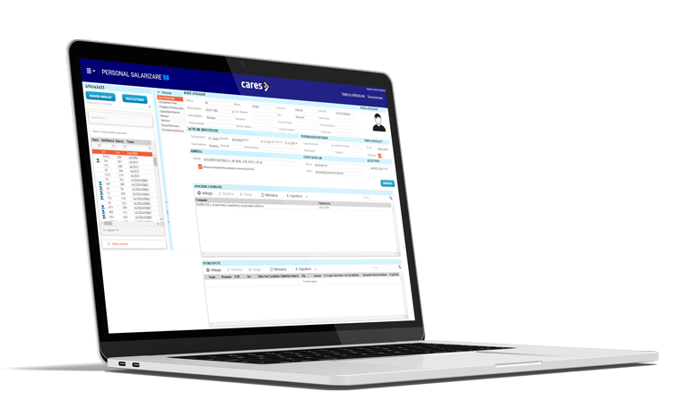 Aplicația Cares HR powered by SOFTONE, prin intermediul modulului de HR, îți oferă posibilitatea să îți desfășori toate procesele de management al resurselor umane dintr-un singur loc. Gestionează-ți cu ușurință dosarele de personal, datele despre pontajul electronic, concedii, rețineri sau declarații, structura organizatorică, șabloanele aferente documentelor solicitate frecvent de către angajați și creează fluxuri automatizate de comunicare cu toți angajații.